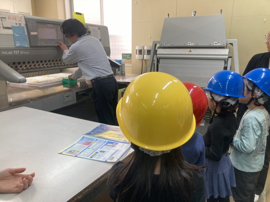 座学では印刷物をルーペで観察して網点の仕組みを学んだほか、実際の印刷機・断裁機など大型機械の見学も実施。